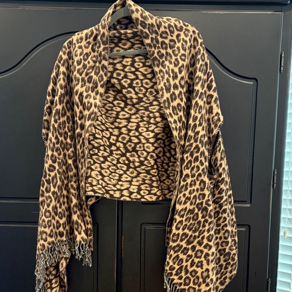Stylish leopard print cape. Open front design. Fringed edges. Perfect for layering.