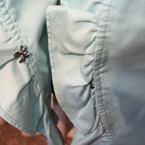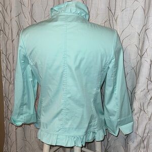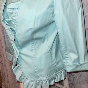 Chic ruffled cardigan in light blue. Perfect for layering.