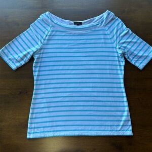 Chic short sleeve top with light blue stripes. Ideal for casual outings. Worn once. Boat neck. Hanging tabs to use clothes hanger. See measurements in photos.