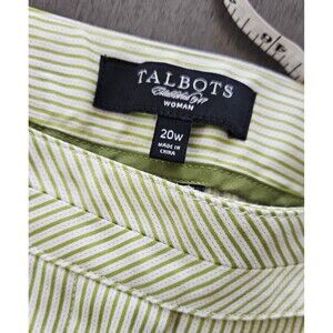 The Talbots Lime Green Pin Striped Cropped Pants in size 20W are a stylish and versatile addition to any woman's wardrobe. Made from a comfortable cotton blend, these pants feature a solid green color with a zip closure and tapered leg style. The pockets add both functionality and style, while the high rise and flat front give a flattering fit. Perfect for casual occasions, these easy-care pants are machine washable and suitable for year-round wear. See pictures for measurements