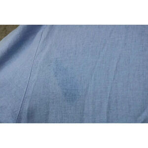 This is a Talbots Linen Blend Midi Button Down Dress that is a size 16. It has embroidered scallops around the collar and trim and florals on the bottom hem. It does have a stain on the front(see pics) and what looks to be an oily stain on the back shoulder. I don't know how much dry clean can take out. It buttons down the front and is 55% Linen and 45% Rayon. Laying flat, it measures: Armpit to armpit-22.5" and the length is 47".