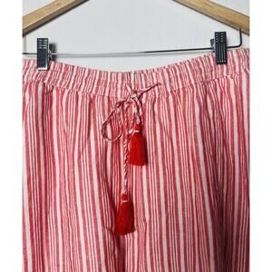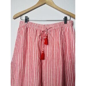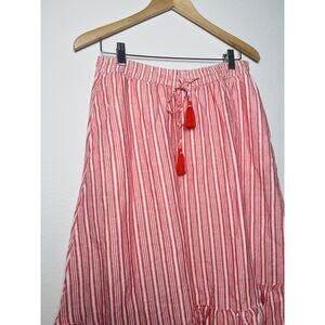 Talbots Linen Blend Red Striped Maxi Skirt in size M is a stylish and versatile piece perfect for various occasions. This lined skirt features a ruffle and flare design with tassel accents, adding a touch of bohemian flair to your wardrobe. Made from a comfortable cotton fabric, this skirt has an elastic waist for easy wear and is machine washable for convenience. Pair it with your favorite top for a chic look that is both effortless and trendy.