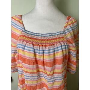 Talbots Linen Blouse Womens Size L Striped Colorful Short Sleeve Square Neck