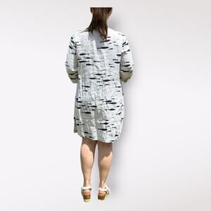 - Linen beaded preppy beachy sundress white and blue fish print Mini dress, lightweight, side slits, breathable, 3/4 sleeves. Perfect for throwing on over a swimsuit on a cruise or beach vacation. **Girl in photos is 5’1, photos taken in natural lighting