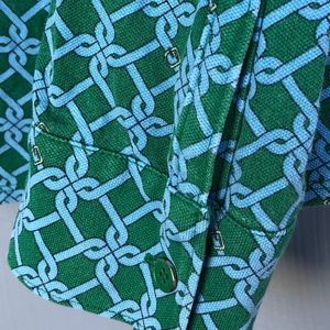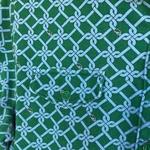 A Talbots long sleeve polo with front buttoned pockets and glossy green buttons add an extra classy touch. Green with light blue chain pattern with buckles. Shirttail hem. Size XL. Gently used condition. NO rips, tears or loose threads but shows some fading from washing. 95% cotton 5% spandex