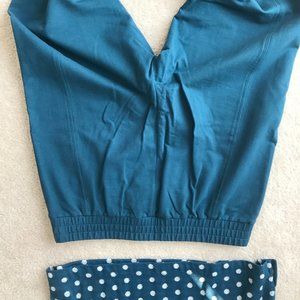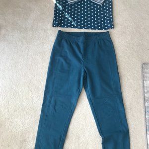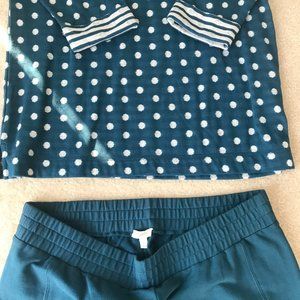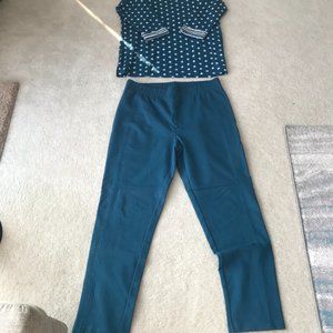 Cute Talbots set, comfortable and playful. White polka dot/ top & dark aqua background, with 3/4 sleeves: L- 26" Length, 14" long sleeves, 22"- between shoulders, polyester/rayon. Solid dark aqua pants, very comfortable, have stretch, size L, 29" inseam, 17" at waist, 90% cotton/10% spandex.