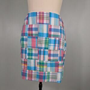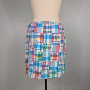 Madras plaid above the knee/mini skirt from Talbots, size 10. Patchwork plaid in turquoise blue, white, pink, green, and yellow. Lined. Side zip. Ideal for preppy, classic, colorful, nautical, and beachy vibes.