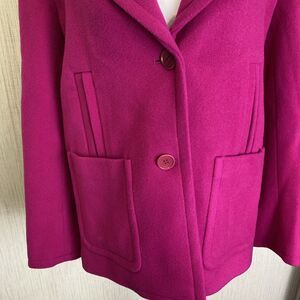 This Talbots pea coat in a stunning magenta hue is a must-have for your winter and fall wardrobe. The coat is designed with an oversized fit and features a button closure, two large pockets, and a short length. The outer shell is made of wool, making it perfect for keeping you warm in the colder months.