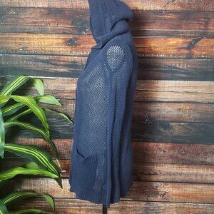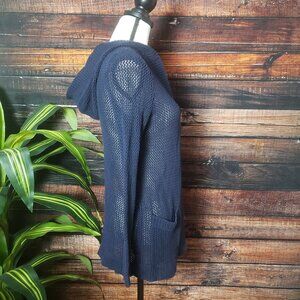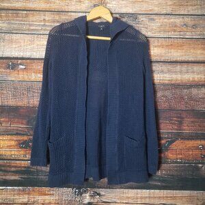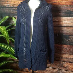 Talbots Medium Petite Open Hooded Loose Knit Cardigan Sweater Navy Blue Cotton