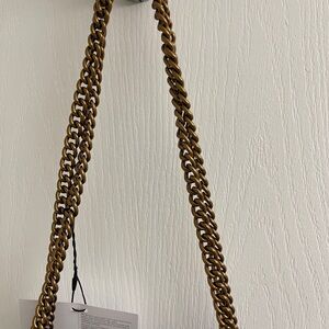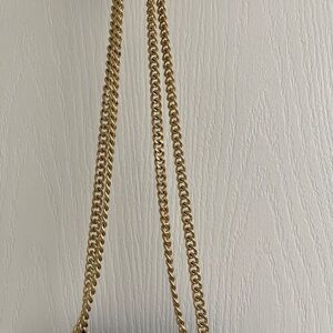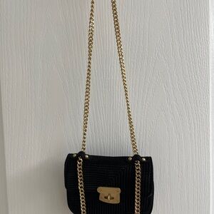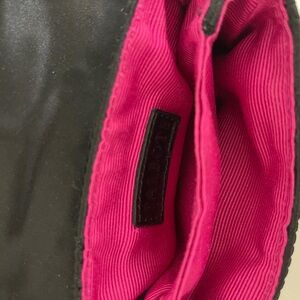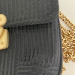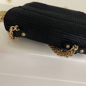 Black textured fabric. Pink fabric lining. Can be used as an evening bag or a casual bag when you just need a small bag for your cards, lipstick and key. Length is 5.5” height 4.5”. Gold hardware & chain shoulder strap that is 23”. Turn lock closure. The tag on the inside states the shell is 100% polyester, trim 100% leather, lining 100% polyester. Can carry as a cross body or shoulder bag.