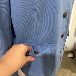 Chic light blue utility jacket with button-up front. Features shoulder epaulettes and front pockets. Ideal for versatile styling. Thick material, perfect for spring. Pre-loved, minor discoloration along the inside of the collar, noted in pic. Exterior of jacket is in great condition. Cotton blend