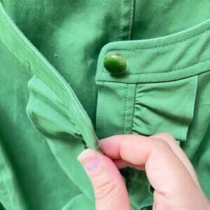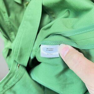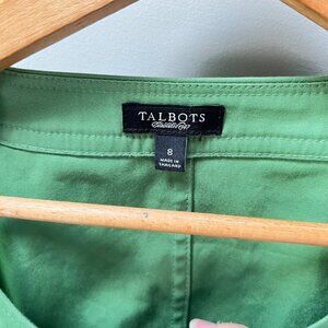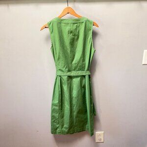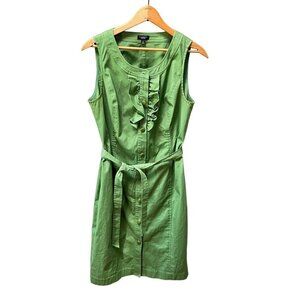 Talbots Mossy Green Knee Length Dress- Size 8. Buttons up the front. Ruffle detail. Belted waist. In very good pre-owned condition. 98% cotton, 2% spandex for some stretch. Heavier weight material.