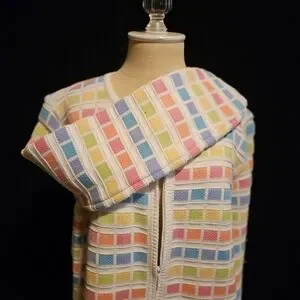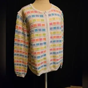 Vibrant cardigan with a grid pattern. Features a mix of pastel shades. Ideal for layering. Front zip.