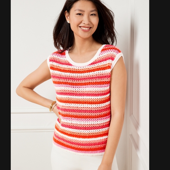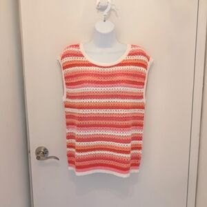 NWT Crocheted Knit Top With Vibrant Sunset Hued Stripes. Features Shades Of Red, Pink, and White. Ideal For Casual Outings or Layering With A T-shirt or Button Up.