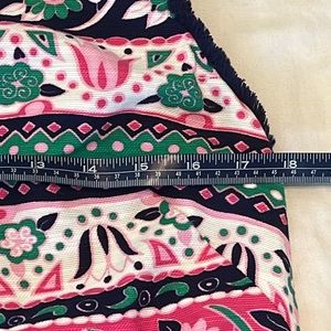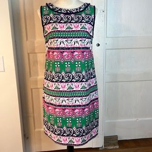 Vibrant sleeveless dress with intricate patterns. Features a mix of green, pink, and black. Perfect for casual outings.