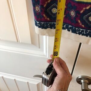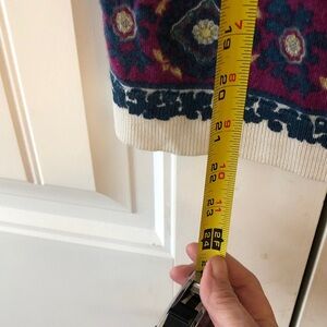 Vibrant sweater with intricate patterns. Features a mix of blue, yellow, and pink hues. Ideal for a bold fashion statement. Merino Wool