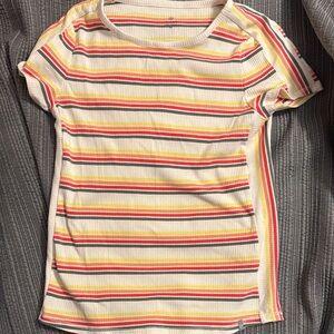 Vibrant ribbed tee with multicolor stripes. Features red, yellow, and cream tones.