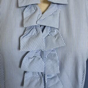 Stunning white & blue stripe 3/4 sleeve blouse with fabric covered buttons and beautiful high quality craftsmanship details.