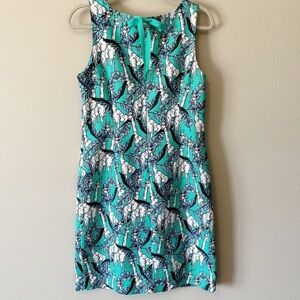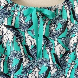 Brand new without tags Talbots safari leaf giraffe print sleeveless shift dress. Size 6. Turquoise blue/green with white, blue, and black accents. Unlined. Zip closure with hook and loop + a tie. NWOT- there is writing on interior care tag.