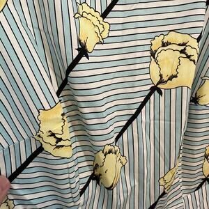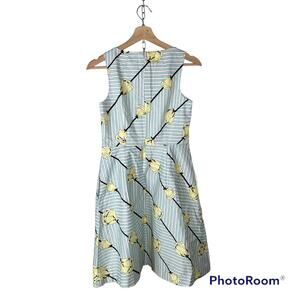 Absolutely stunning & beautiful dress features a blue, black, and white striped background with yellow flowers. Other features include pockets, lining, and a zip back.