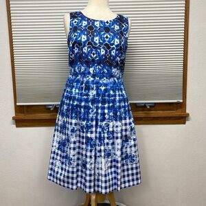 Talbots NWT Blue Floral Ombre Gingham Printed Fit And Flare Pleated Dress
