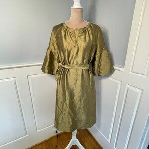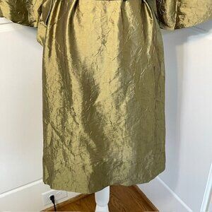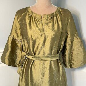 Bronze silk and nylon blend lightweight puff sleeve dress. Flowy dress with self belt and drop shoulder gathered puff 3/4 length sleeves, round split neck. Versatile semi-formal or formal dress, wear it belted with the self-belt or add your own belt, or wear it loose for a comfortable, flowy, casual look. Lightweight unlined silk and nylon. The color is bronze, deep gold with olive undertones and a metallic shimmer. Perfect for a cocktail party, night out or holiday party, sophisticated but comfortable formal dress. 79% Silk 21% Nylon, Dry Clean. New with tags, size small.