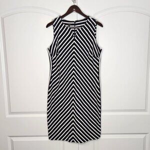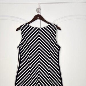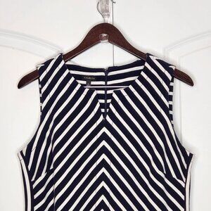 Lovely navy blue & white Breton striped maritime shift dress. Sleeveless. Stretchy. Features diagonal stripes for a slimming effect. Notch collar, princess seaming. Concealed zipper and hook & eye closure on the back.