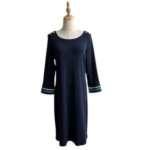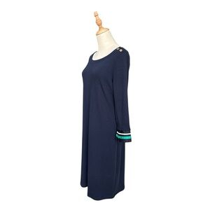 Talbots Nautical Gold Button Navy Blue Statement Sleeve Sheath Dress Size Medium in very nice used condition. This classic dress is 100% Jersey cotton with pullover styling. It has a boat neck collar with two gold buttons on each shoulder and pleated green, black and white cuffs on the long sleeves. It is a soft cotton with a nautical vibe to it. Measurements are approximately 18” inches underarm to underarm and from shoulder to hem approximately 39” inches. Just adorable ⚓️