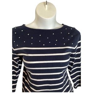 Elegant ashy navy top with white horizontal stripes. Features dotted accents on the upper front. Perfect for casual or dressy occasions. 100% Cotton,Talbots Ashy Navy Blouse with White Stripes and Dots, Plus Size 2X.