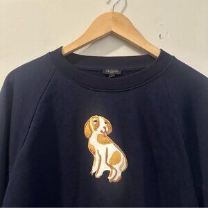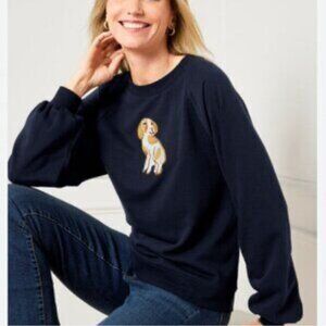 This Talbots Dog Days sweatshirt is a cozy yet charming piece that brings a playful touch to casual style. Crafted in soft navy fabric, it features adorable embroidered dog motifs and feminine blouson sleeves for an elevated twist on a classic sweatshirt. Perfect for relaxed weekends, coffee runs, or lounging in style.