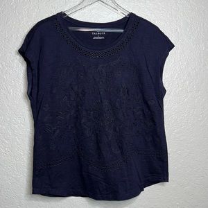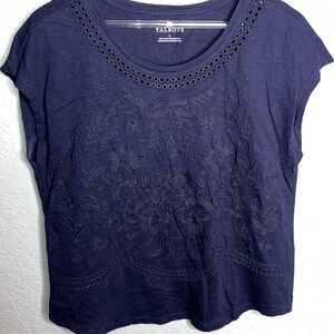 Talbots Navy Blue Embroidered Flower Print Short Sleeve Top