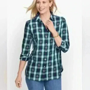 Talbots Navy Blue Green Red Plaid Snowflake Long Sleeve Button Up Dress Shirt XL