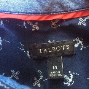 Talbots Navy Blue with White Anchor Print Nautical Long Sleeve EUC Shirt Size 14