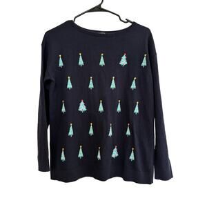 Talbots Navy Crew Neck Embroidered Christmas Tree Holiday Sweater SP Winter
