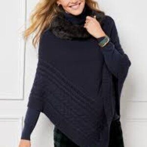 Talbots Navy Faux Fur Cowlneck Wool Blend Cable Knit Poncho Size L NEW