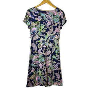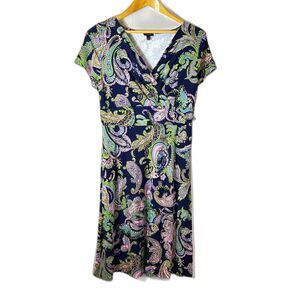 Talbots Navy Multi Paisley Surplice V-Neck SS Fit and Flare Midi Dress Size M