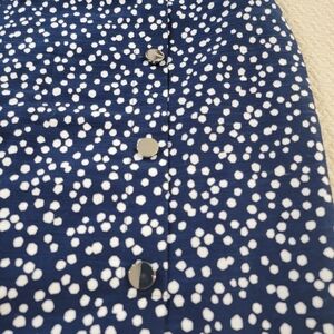 Chic navy skirt with playful small irregular shape white polka dots. Buttons on the front side create a partial wrap style design. Perfect for any occasion from casual outings to the office. Lined. 99% cotton 1% spandex