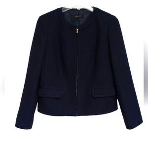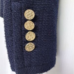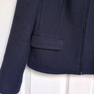 Talbots Navy Textured Blazer Jacket with gold color buttons on sleeves/gold color zipper. Flap front pockets. Lined.