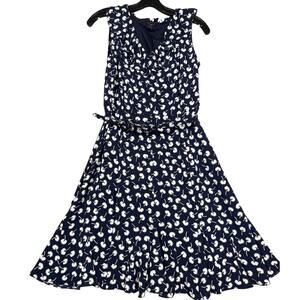 Talbots Navy White Floral Flutter Hem Belted Dress 8P Petite