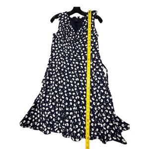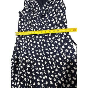 Pre-owned Talbots sleeveless fit and flare dress in a navy blue and white dandelion floral print. Features a soft flutter neckline, a matching removable belt, and a gently fluttered hem that adds movement. Fully lined with no pockets. Petite size 8P. A flattering silhouette perfect for work or warm-weather occasions.