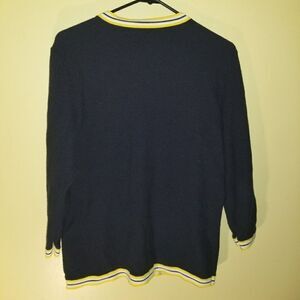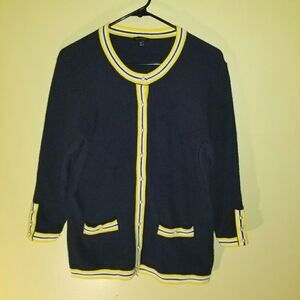 Item: women's navy textured stretchy cardigan sweater, bright yellow stripe trim, pearl buttons, front pockets, size medium