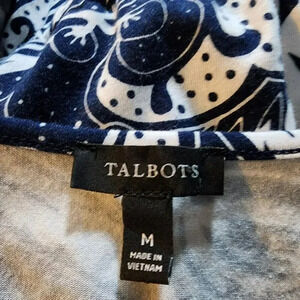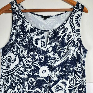 This beautiful Talbots dress is perfect for any occasion. The navy and white floral print adds a touch of elegance while the keyhole neck and sleeveless design keep it practical for warmer weather. The dress is made of a comfortable and breathable spandex, cotton, and modal blend jersey fabric that fits machine washable. It comes in a size M, with a round neckline and pullover closure.