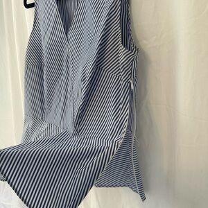 Chic sleeveless blouse with navy and white stripes. Features a flattering V-neck and wrap design. Ideal for versatile styling. Can be worn with a thin belt too!