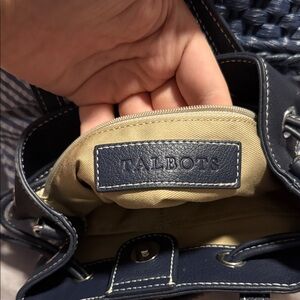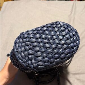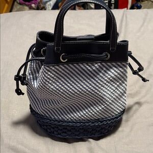 Chic navy and white striped wristlet. Features drawstring closure and woven base. Ideal for casual outings.