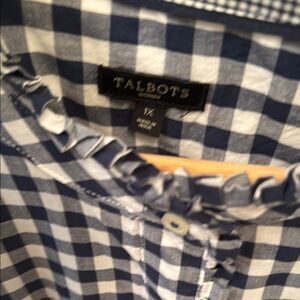 Chic gingham blouse by Talbots. Features navy and white pattern. Button-down front. Long sleeves. Perfect for casual or office wear. 3/4 button front with ruffles detailing Length is approximately 27 inches long Bust measuring approximately 23 inches across Curved hem fitted seams in back EUC