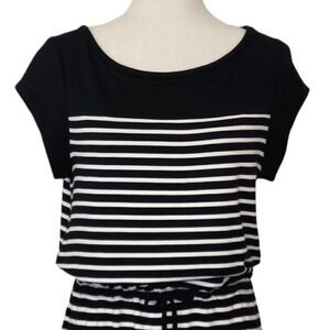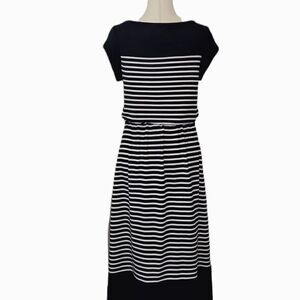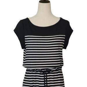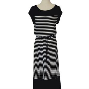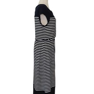 Talbots Navy Blue Striped Cap Sleeve Drawstring Side Slit Maxi Dress Size LP