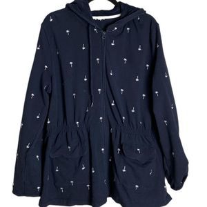 Talbots Navy Blue Knit Hooded Jackie. Decorated with white palm trees. Zip front. Two front pockets. Roll tab sleeves. Drawstring on hood. Elastic waistband. Item in good preowned condition.