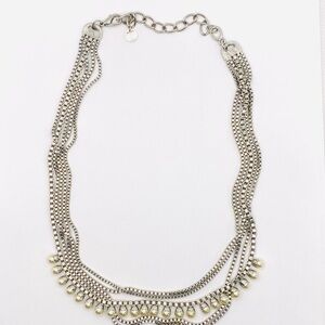 A beautiful necklace features multiple box chains with faux pearls. The necklace marked T. Pre-owned necklace is in an excellent condition. Please, see pictures for more details.