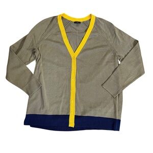 Stylish gray cardigan featuring vibrant yellow trim and a bold blue hem. Perfect for layering.