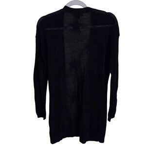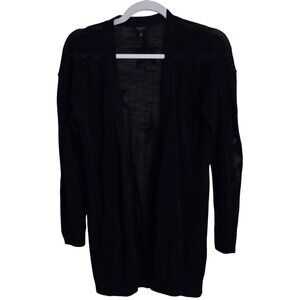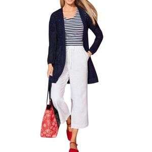 This Talbots navy cardigan features a stylish open front design with tone-on-tone star patterns. Made from sustainable cotton, it's lightweight and perfect for layering. Retailing at $100, this piece offers long lines and a flattering fit. Ideal for various occasions, it's a timeless addition to your wardrobe.